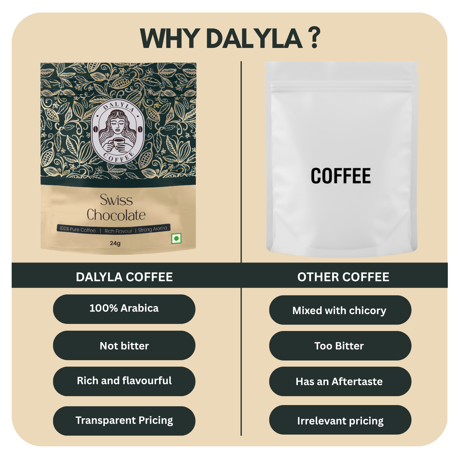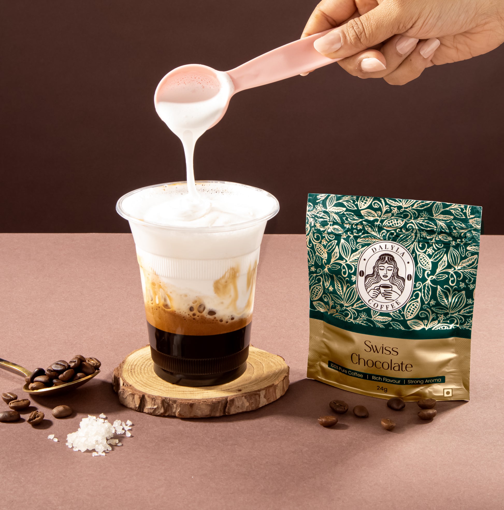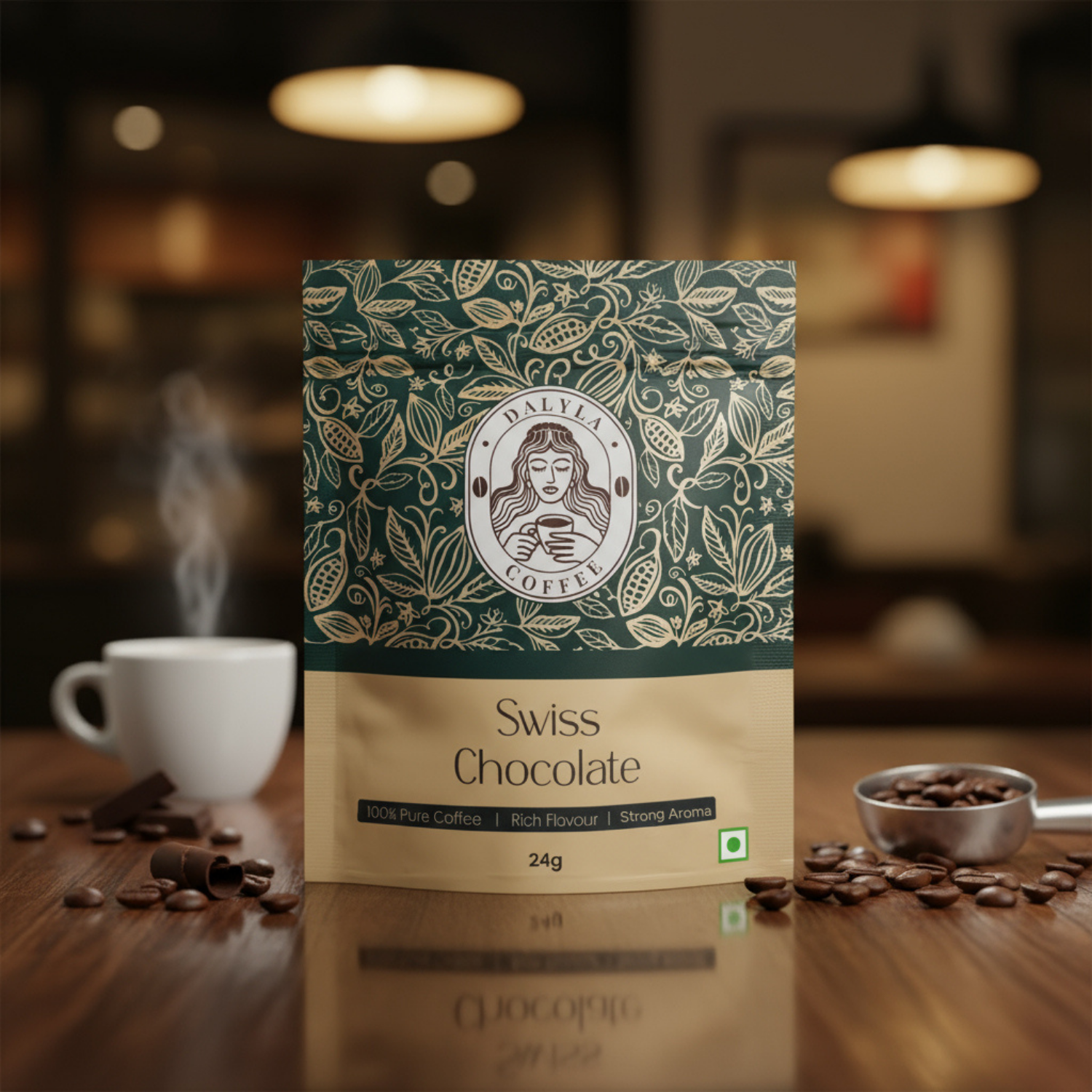 Awaken your senses with Dalyla's Swiss Chocolate Instant Coffee. A luxurious fusion of smooth coffee and fine Swiss chocolate. Decadent, rich, and crafted for pure indulgence.